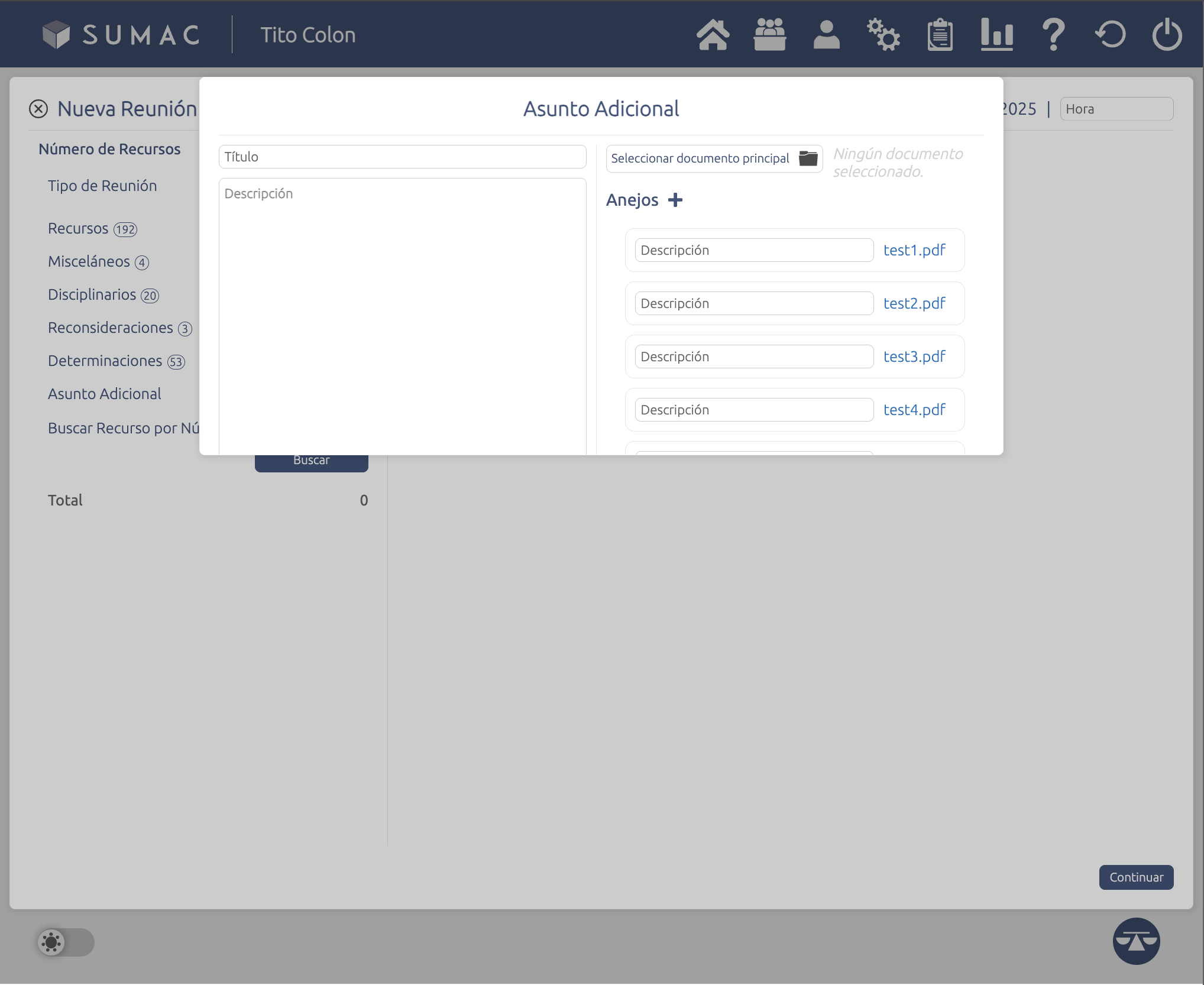 Crear reunión -> Añadir Asunto Adicional -> Subir muchos anejos