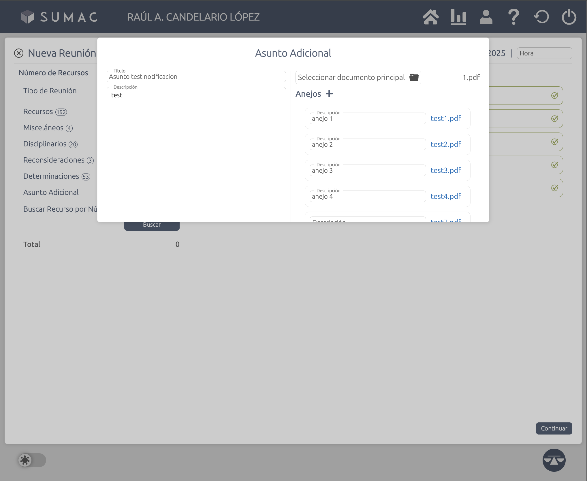 Crear reunión -> Añadir Asunto Adicional -> Subir muchos anejos