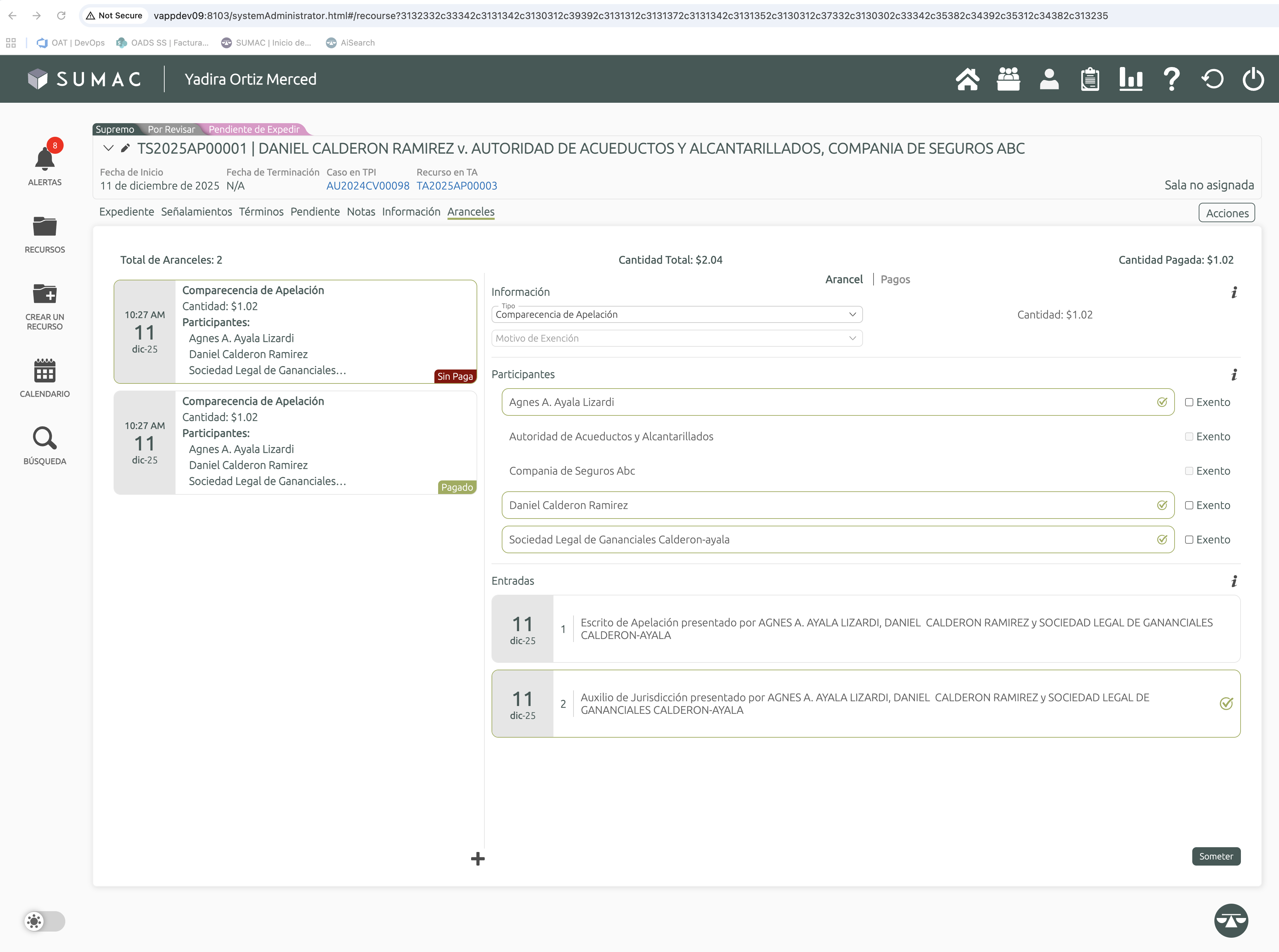 Parece que si se crea el recurso con moción de auxilio se crean dos aranceles y debería ser solo uno.