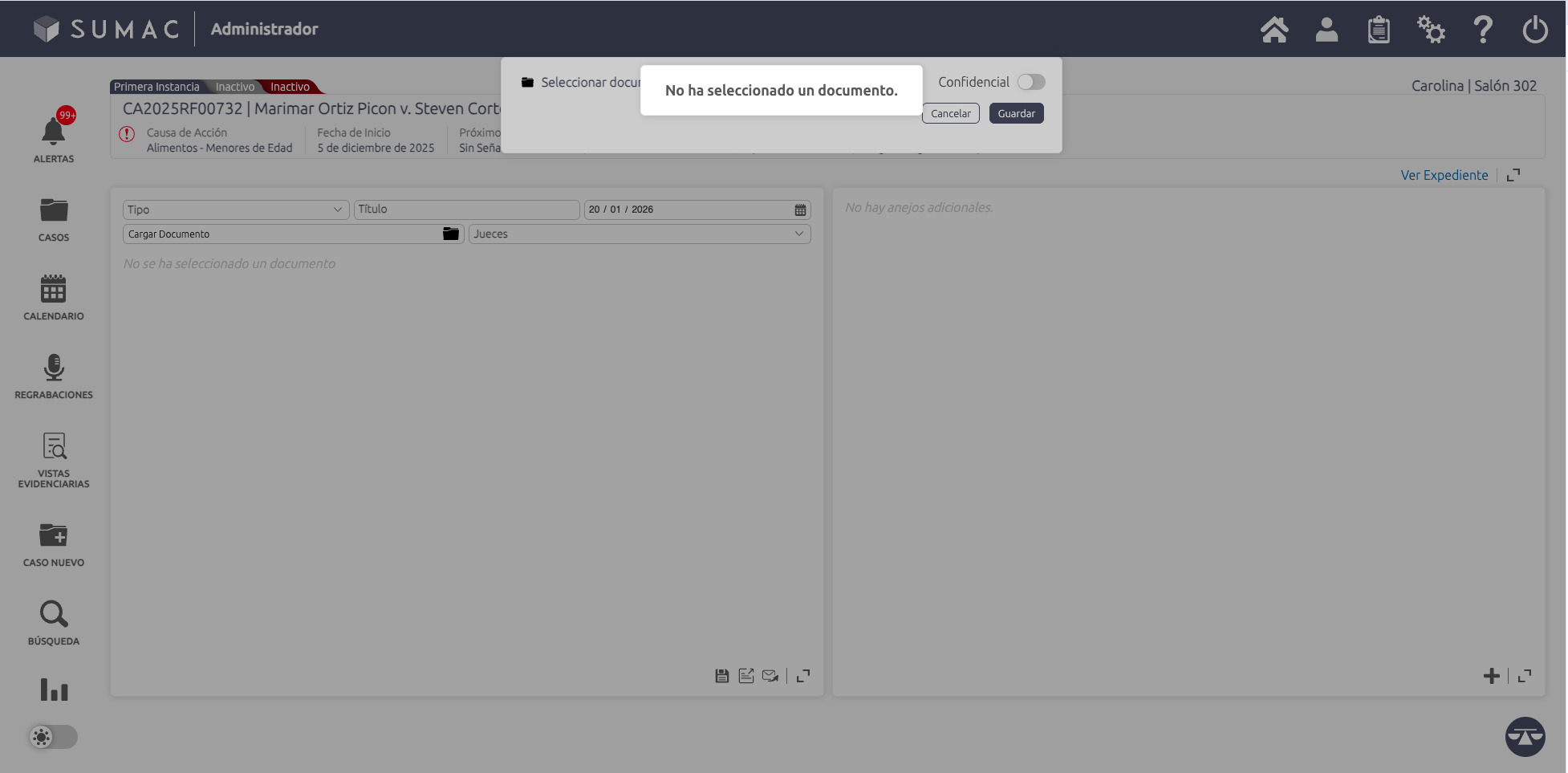 No permite subir documentos judiciales. Aunque el personal escoja documento de la carpeta, al regresar al sistema, emite mensaje de error.
