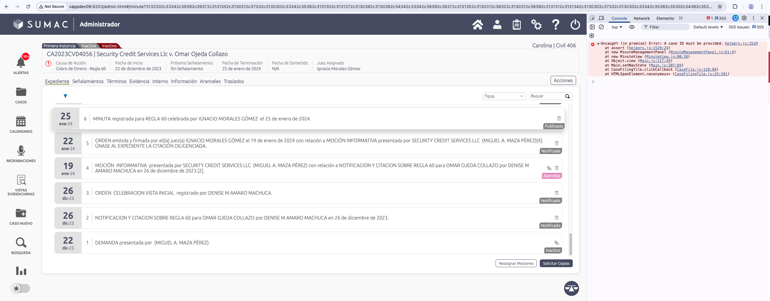 El sistema no está mostrando las Minutas al ver Expediente. Muestra la anotación, pero al seleccionarla, la pantalla no navega a la pantalla del documento para poder ver el pdf. El sistema no emite ningún mensaje de error.