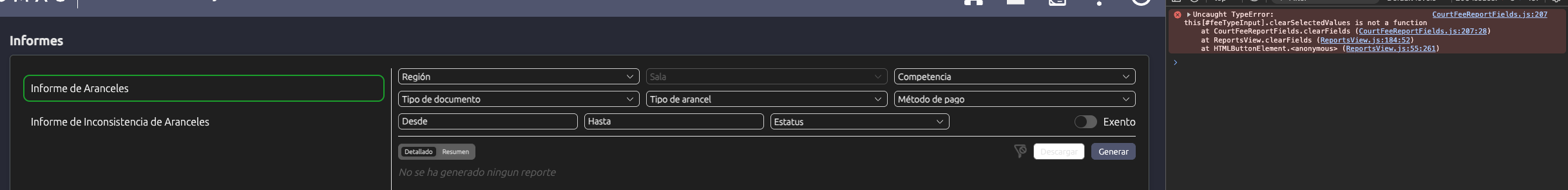 Presionar el embudo produce un error en la consola.