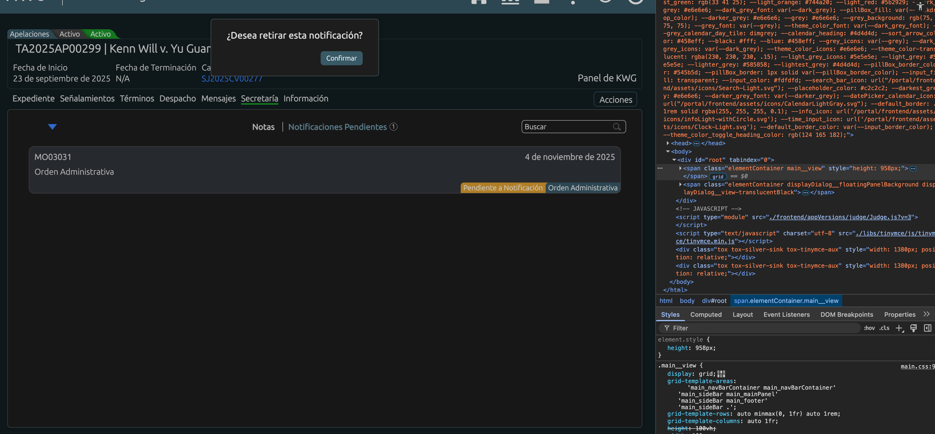 No Pasó: Permite realizar la orden administrativa. Sin embargo, no permite retirar la misma, Aparece en la sección de Secretaría "Notificaciones pendientes". Por otro lado, la orden no aparece en ALERTAS tab de Secretaría "Notificaciones pendientes".