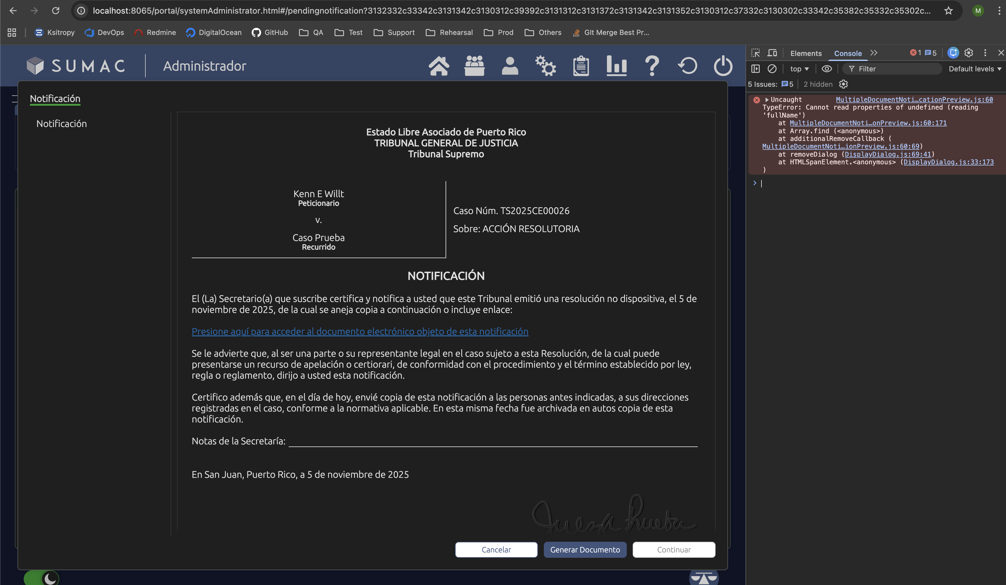 En el view de notificar una determinación, si notifico y presiono continuar en el displayDialog sin generar el documento aparece un error en consola.