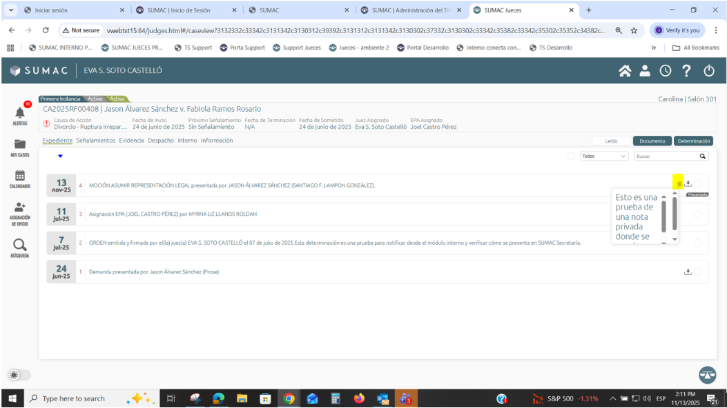 Se solicita que en las Notas se incluya la funcionalidad desarrollada para SUMAC TA donde permite al Juez marcarlas para que solamente las vea el Juez que las registró. Funcionalidad para el EPA y para el Juez.