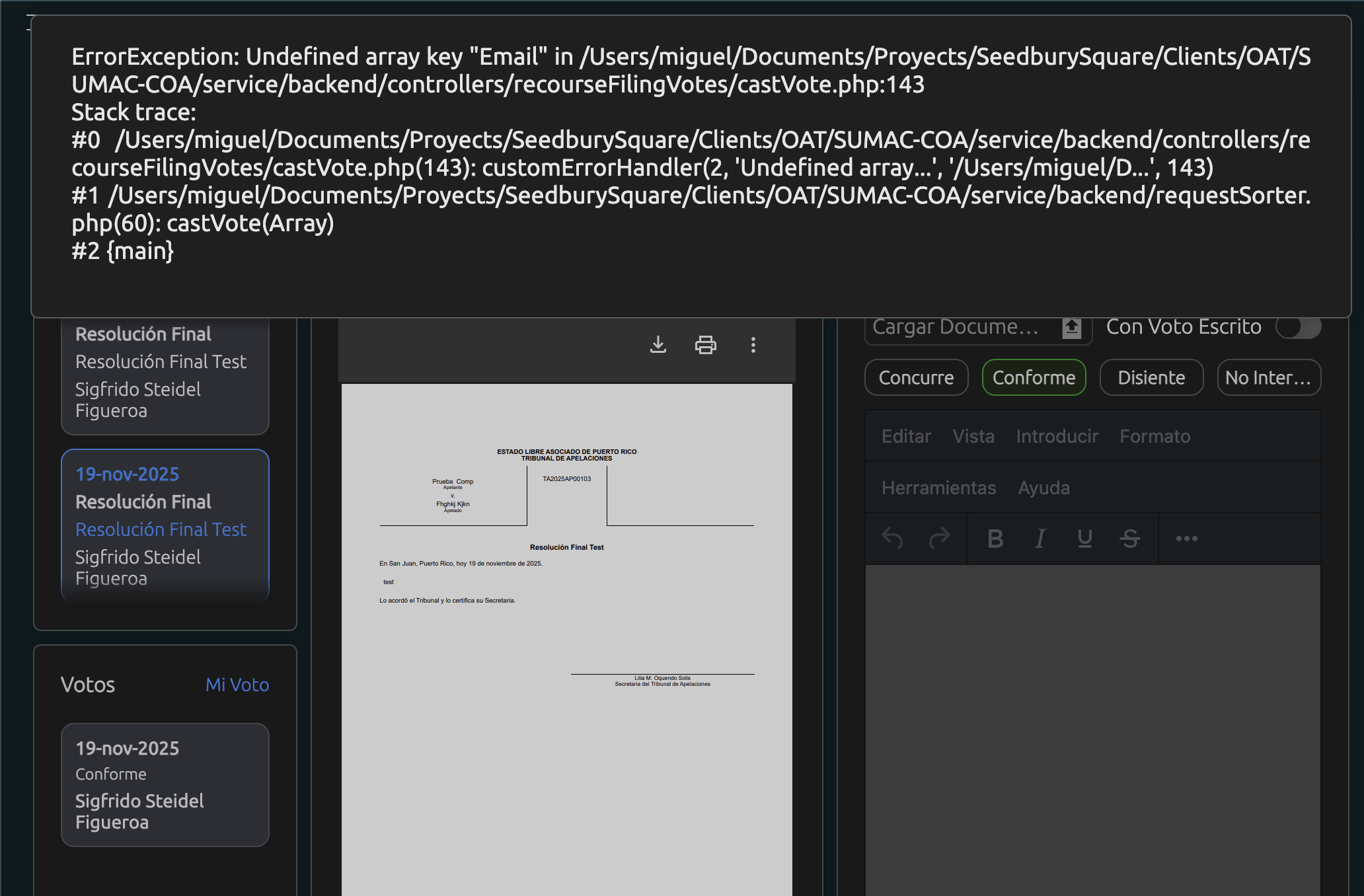 ErrorException: Undefined array key \"Email\" in /Users/miguel/Documents/Proyects/SeedburySquare/Clients/OAT/SUMAC-COA/service/backend/controllers/recourseFilingVotes/castVote.php:143